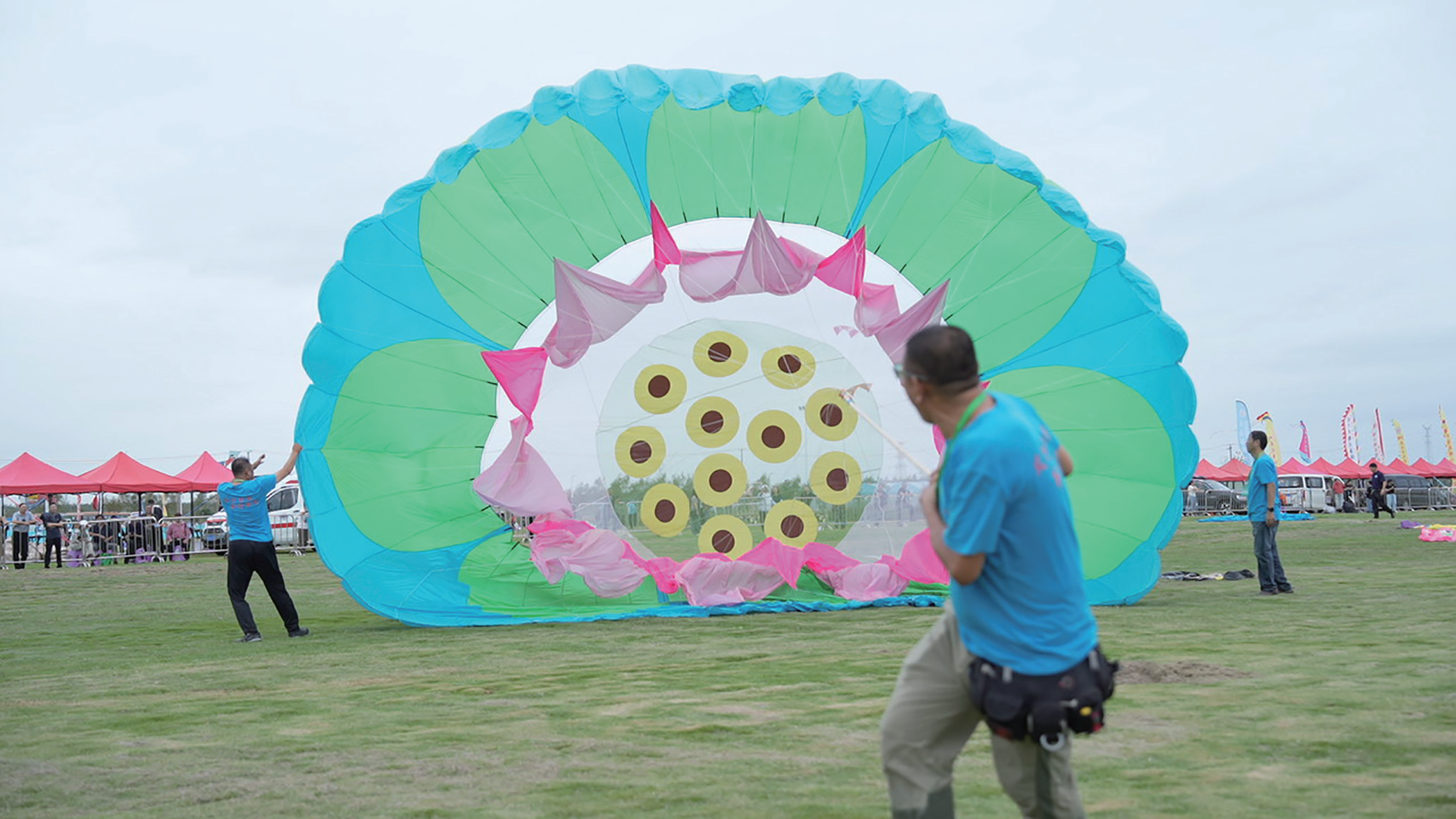 “快看!那几只粉色带边花的风筝飞得真漂亮!” 顺着身旁观众的呼声望去,盛京海有风筝队的运动风筝格外亮眼。领队刘永斌笑着介绍:“这是我自己设计制作的品牌风筝,两个V字穿插的造型,寓意‘团结起来取得更大的胜利’;风筝上印的‘海有’拼音,取自‘海纳百川,有容乃大’,也是我们团队的初心。” 不远处,如东风筝协会副主席刘剑锋带来的“127串联”风筝同样吸睛,127个小六角组成的风筝上,蓝印花布的图案细腻精致,将南通两项非遗完美融合。这一个个独具特色的风筝,不仅是美的展示,更是风筝比赛“工艺”比拼的生动体现。