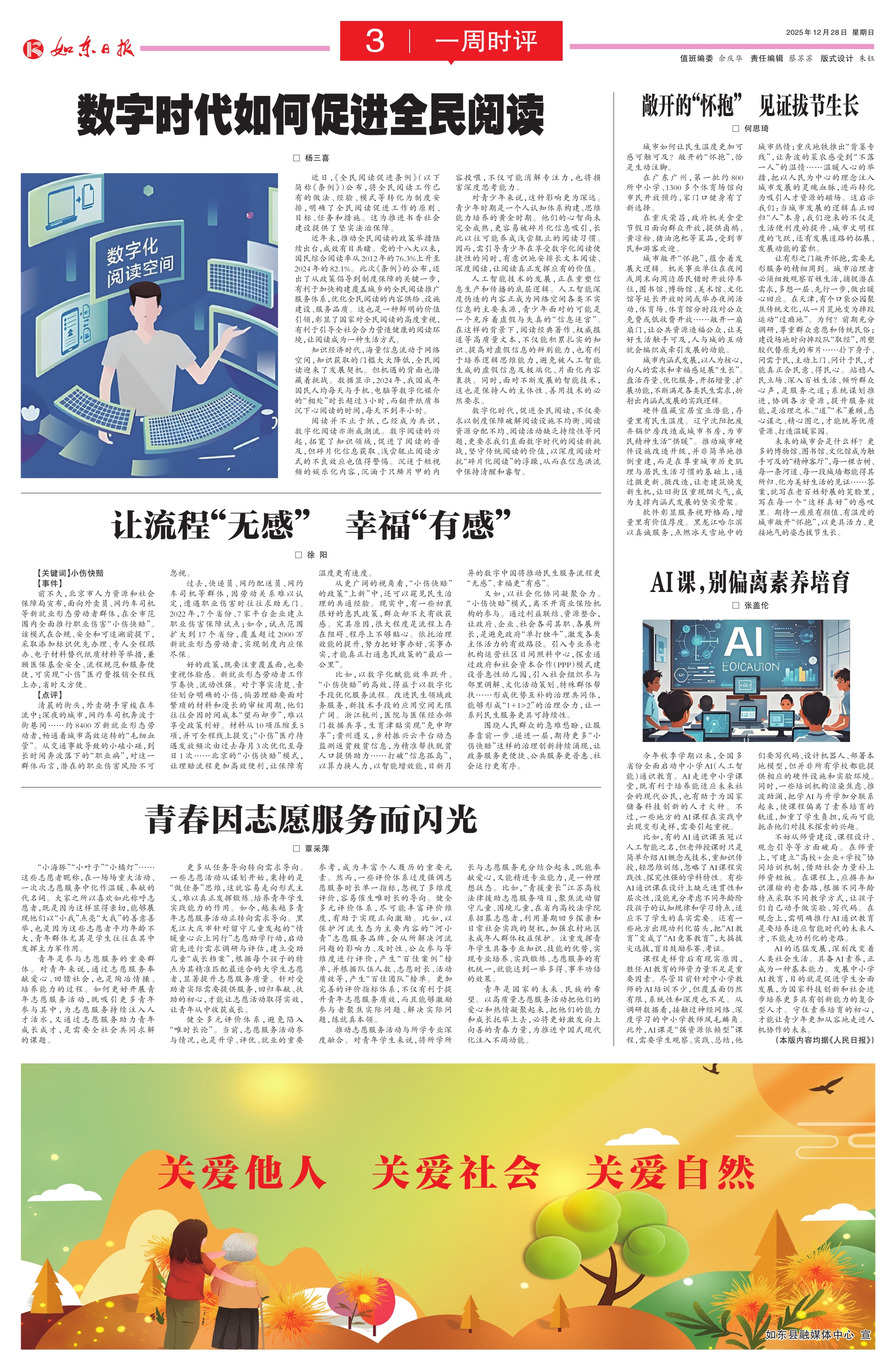 AI的迅猛发展,深刻改变着人类社会生活。具备AI素养,正成为一种基本能力。发展中小学AI教育,目的就是促进学生全面发展,为国家科技创新和社会进步培养更多具有创新能力的复合型人才。守住素养培育的初心,才能让青少年更加从容地走进人机协作的未来。