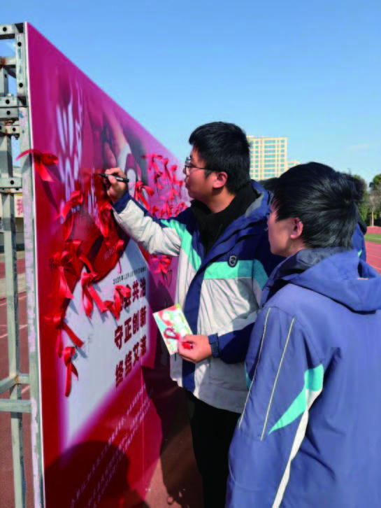 同学们亲手制作红丝带,并书写防艾宣传或反歧视寄语、签名,完成即可获得纪念品一份,在情感共鸣中强化防艾意识。